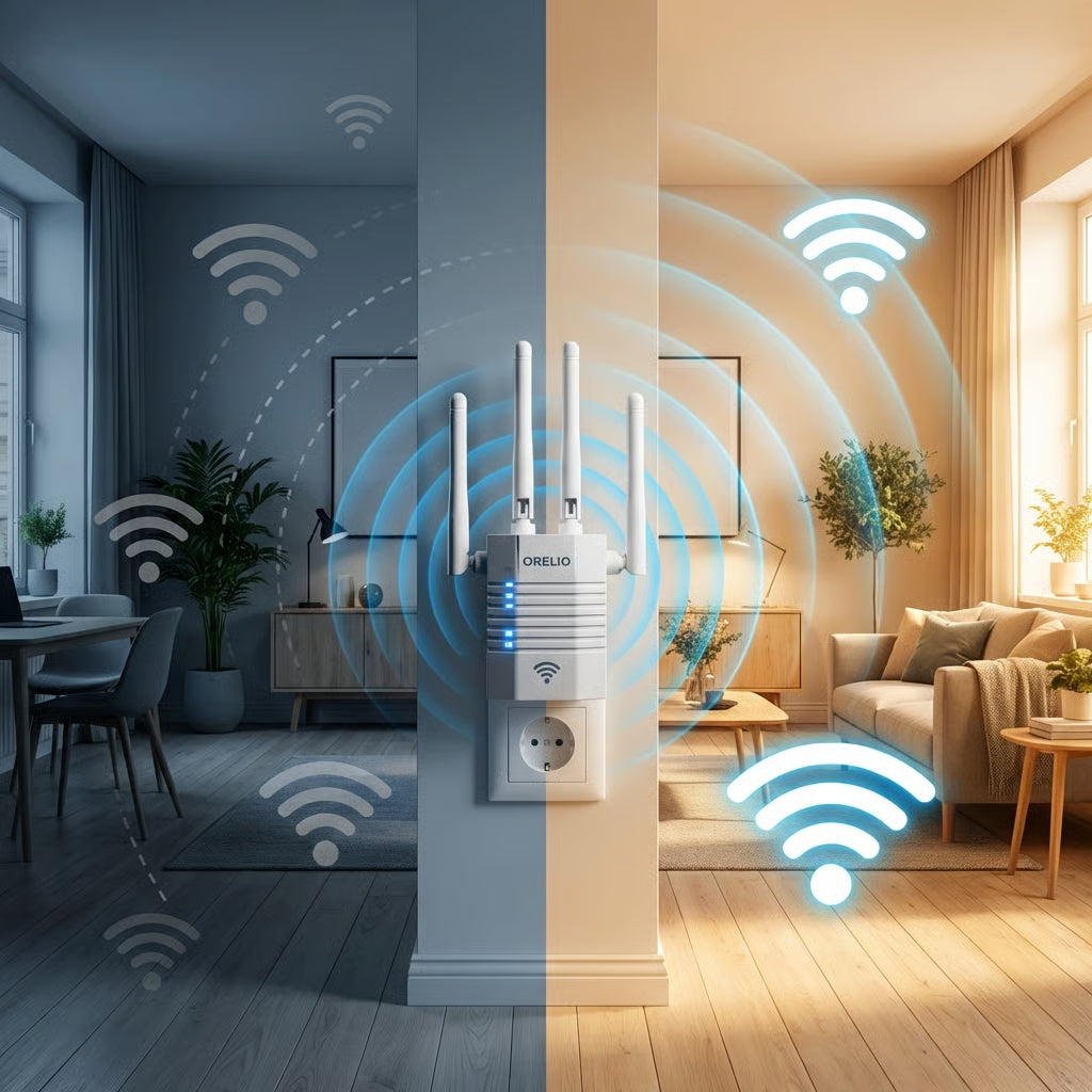 Orelio wzmacnia zasięg istniejącej sieci, zapewniając stabilniejsze połączenie w całym domu, bez kabli i kosztownej wymiany routera.
